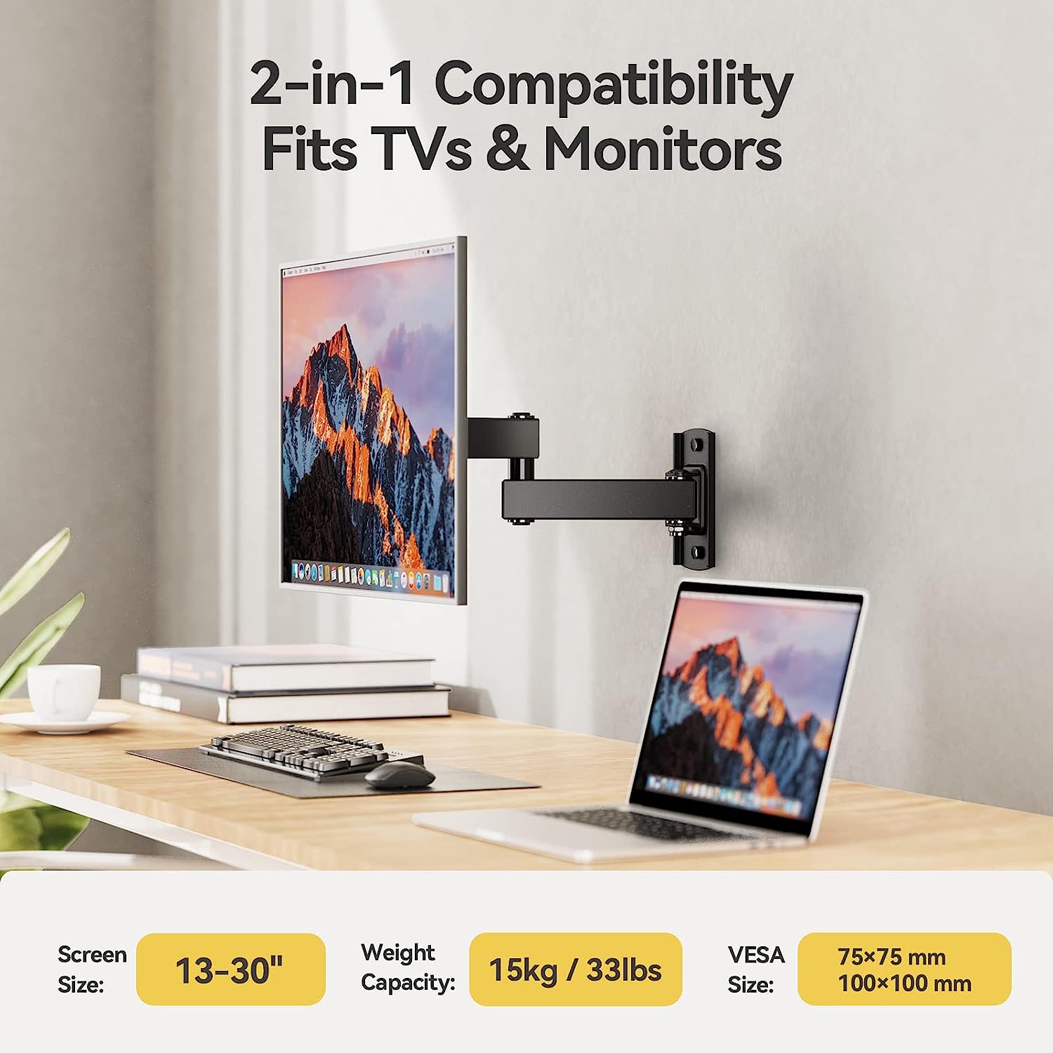 - Compatibility: Fits most TVs and monitors from 13-30 inches (33-76 cm) with a maximum weight of 15 kg. Supports VESA patterns of 75×75 mm and 100×100 mm. Check your TV’s size, weight, and VESA pattern before purchase.