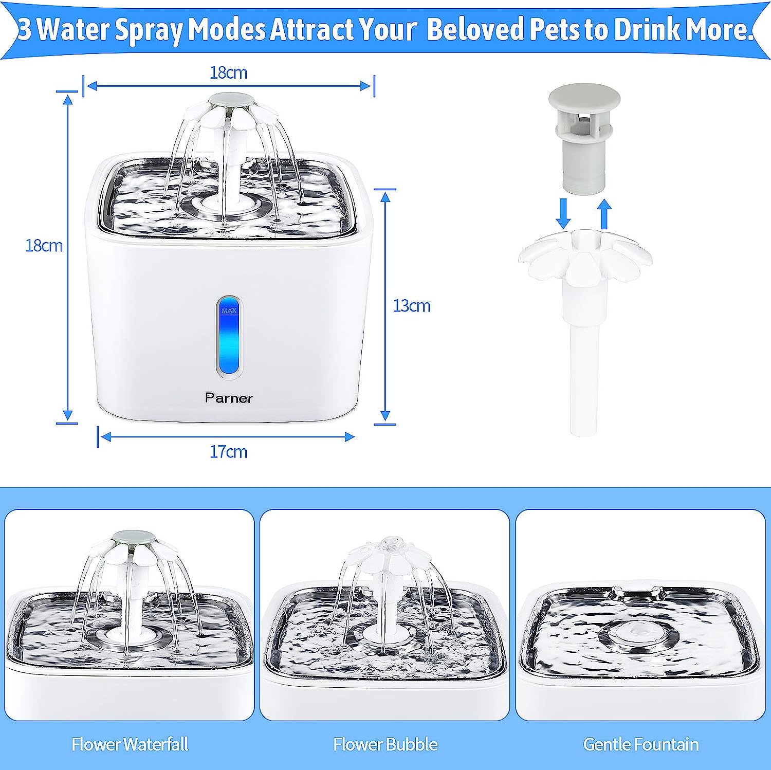 - Modes: Flower Waterfall, Flower Bubble, Gentle Fountain