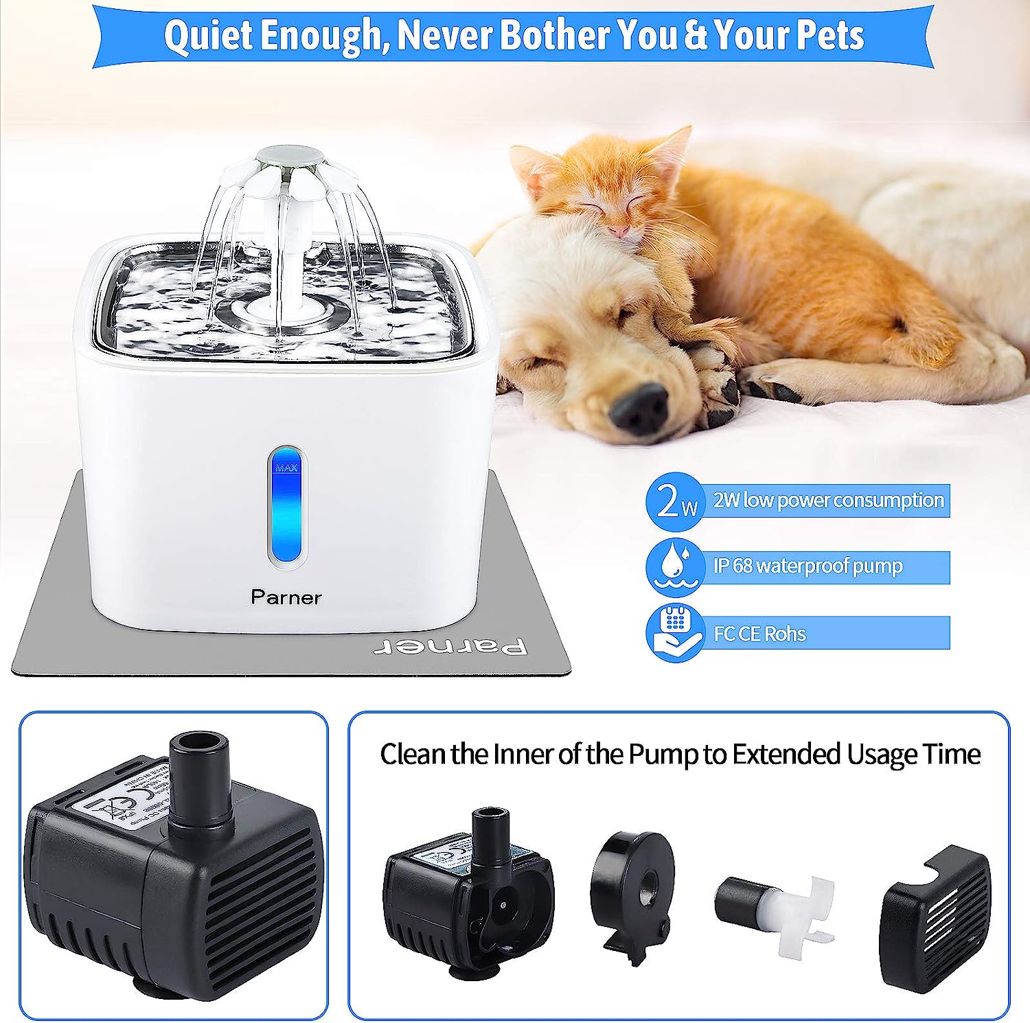 - Quiet Operation: Ultra-quiet with low consumption, minimal noise, and a calming water flow sound
