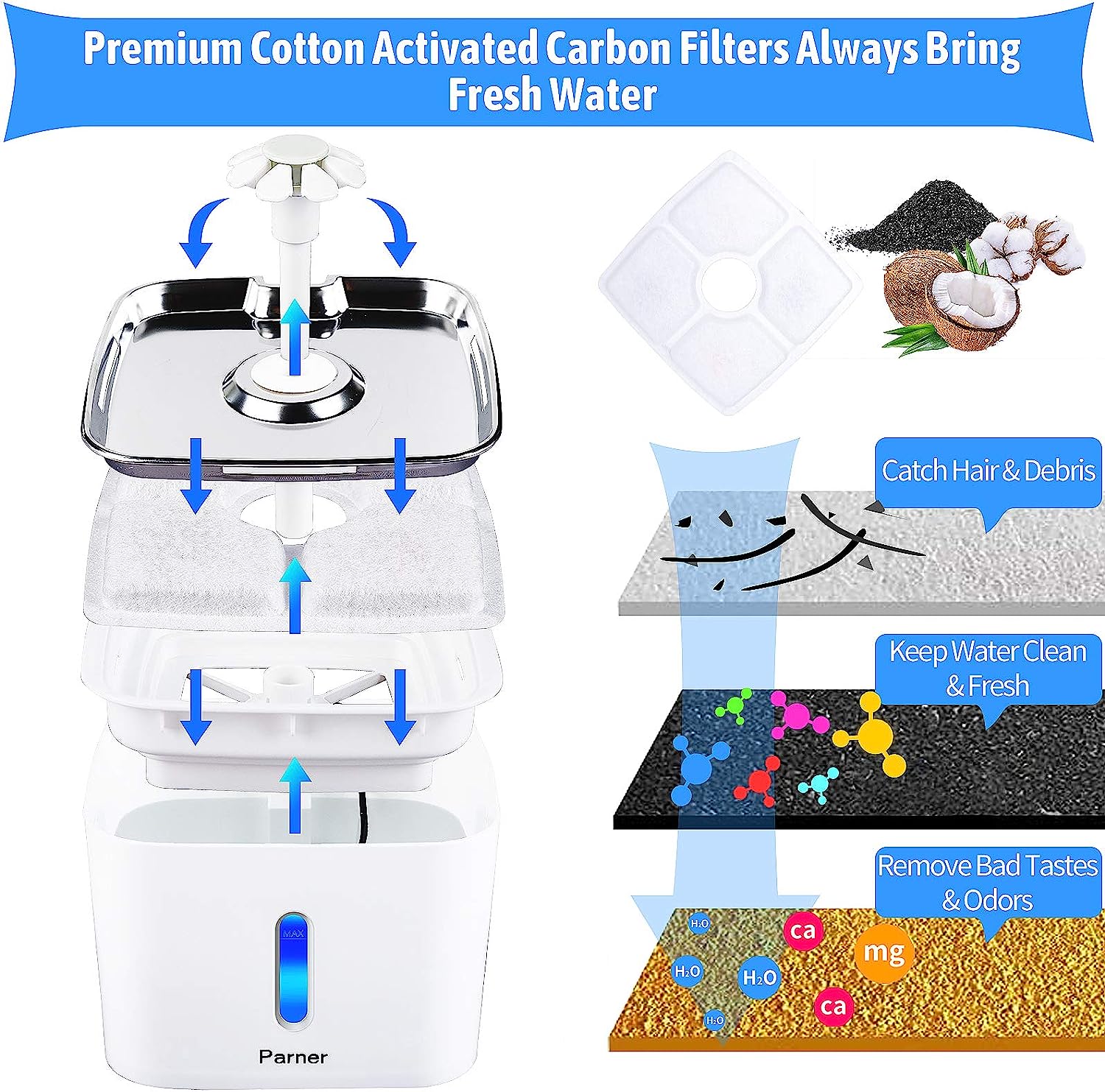 - LED Light: Blue LED light to attract pets and illuminate the fountain at night (can be turned off if not needed)