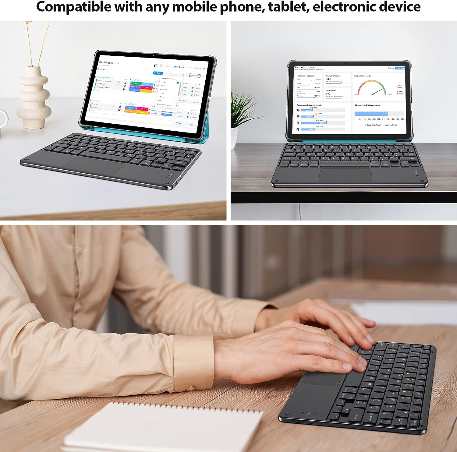 • Quiet Bluetooth keyboard ensures discreet typing without causing disturbances.