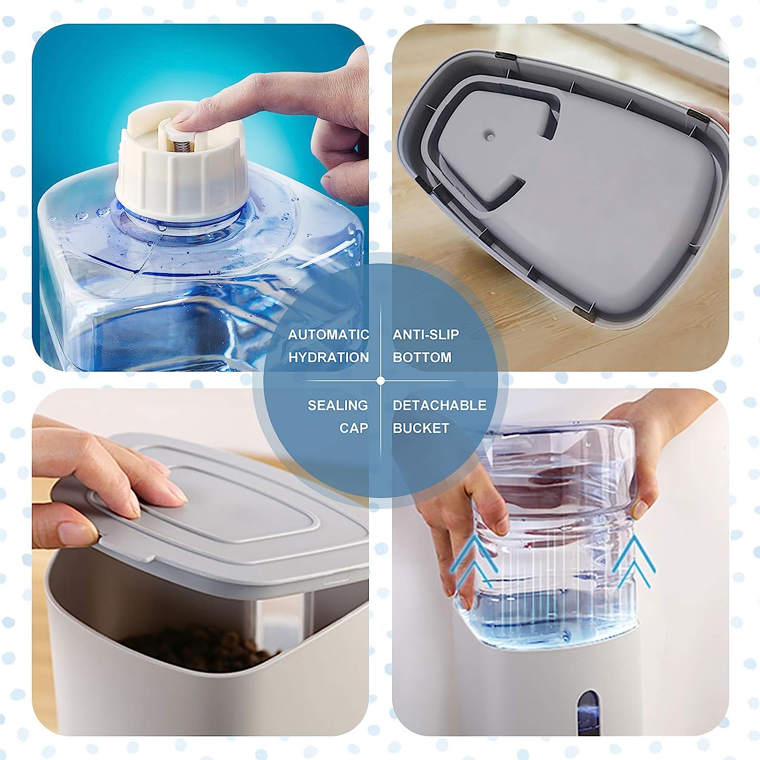 - Water Dispenser: Fill by tipping the bottle upside down, pour water, then reattach the base.
