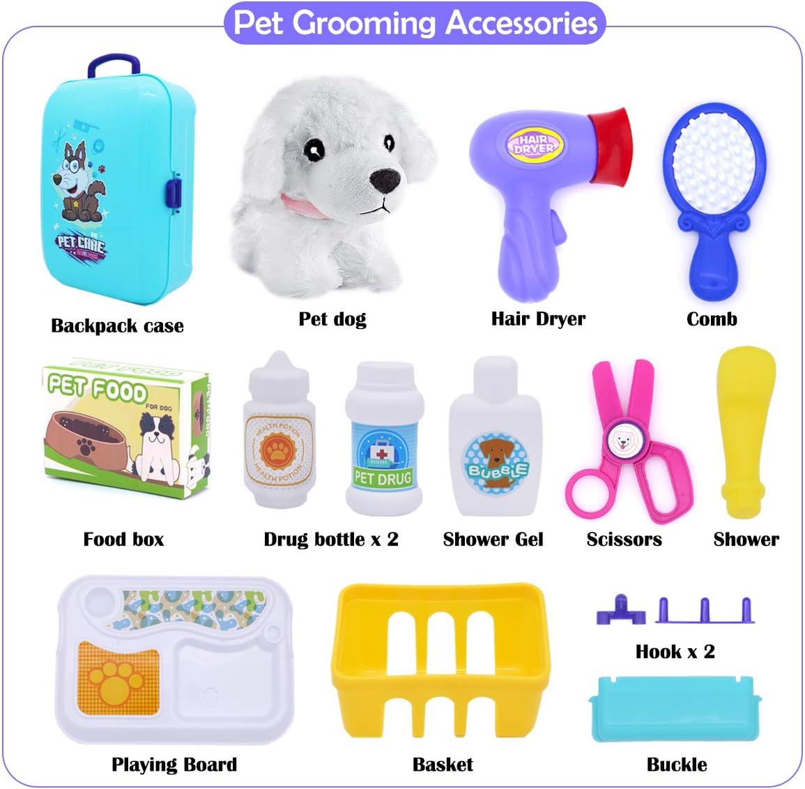 - Items: Plush dog, scissors, hair dryer, brush, faucet, food box, shower gel bottle, and various other accessories