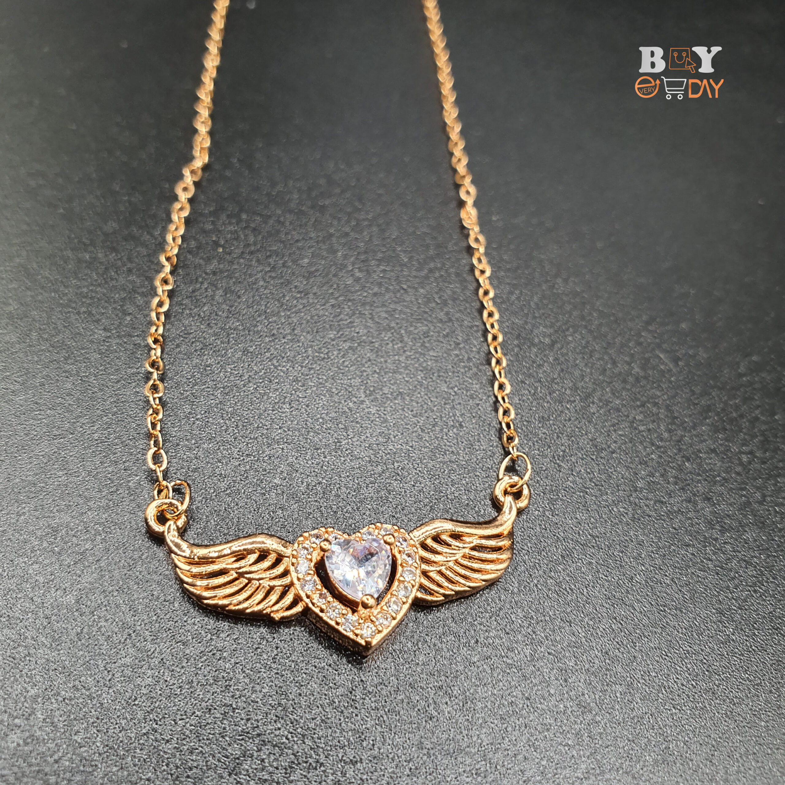Adorn yourself with our exquisite winged heart flying heart angel necklace in a stunning gold tone. This captivating piece is designed to symbolize love, freedom, and grace, making it the perfect accessory for any occasion.